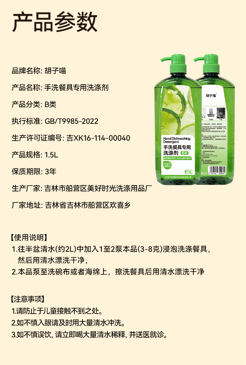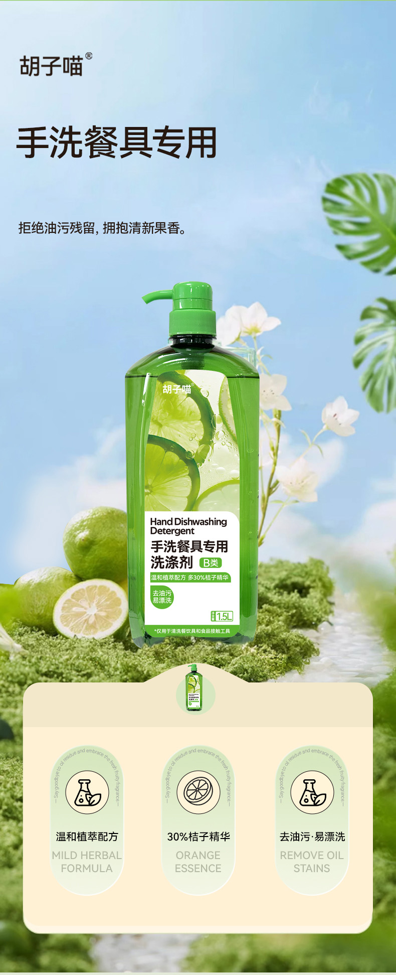 胡子喵手洗餐具专用洗涤剂超强去油深层洁净温和不伤手强力去污洗洁精 1.5L/瓶