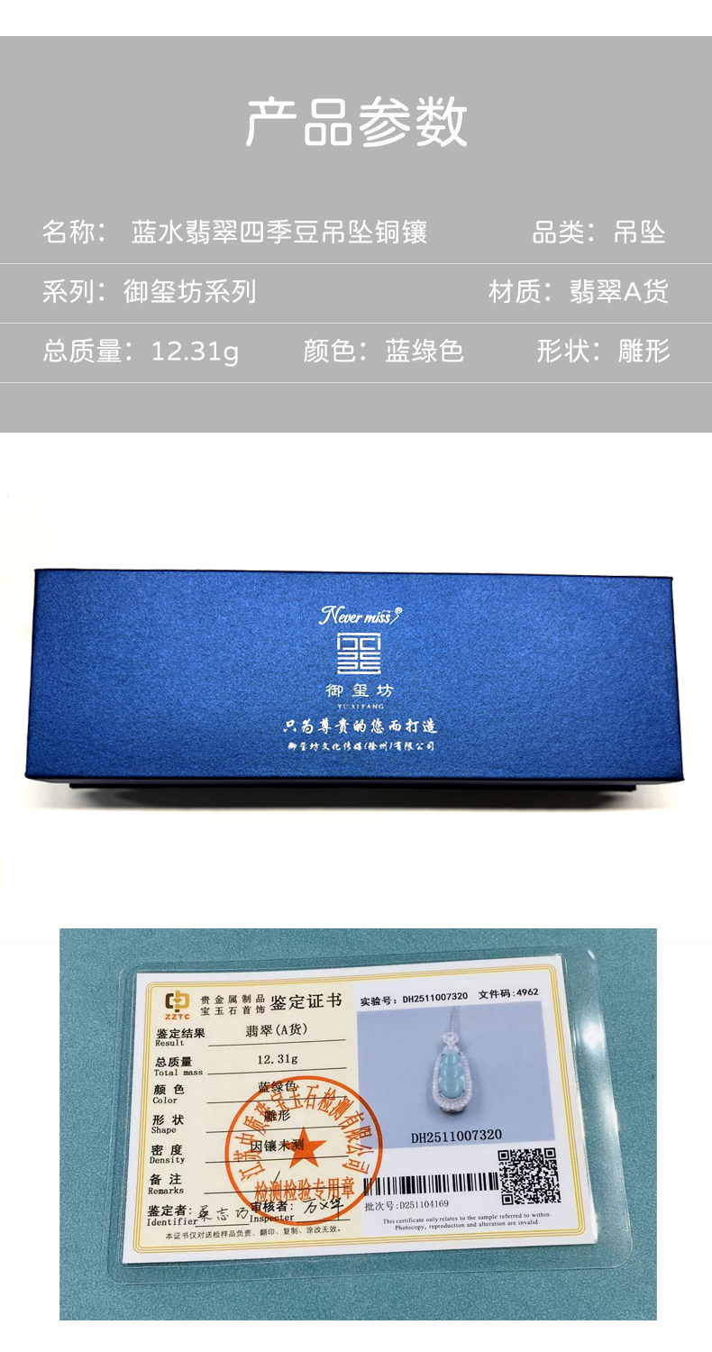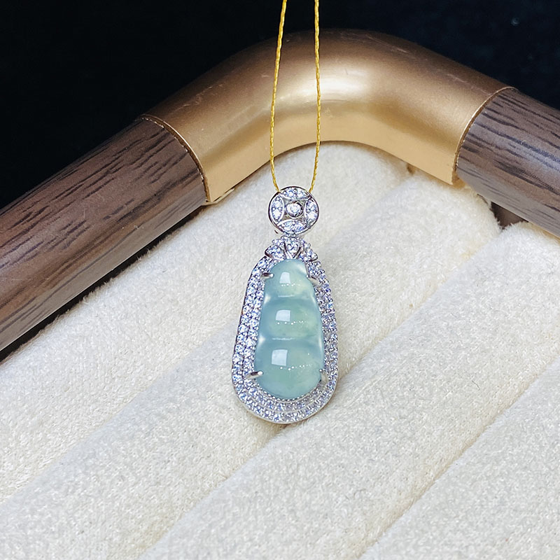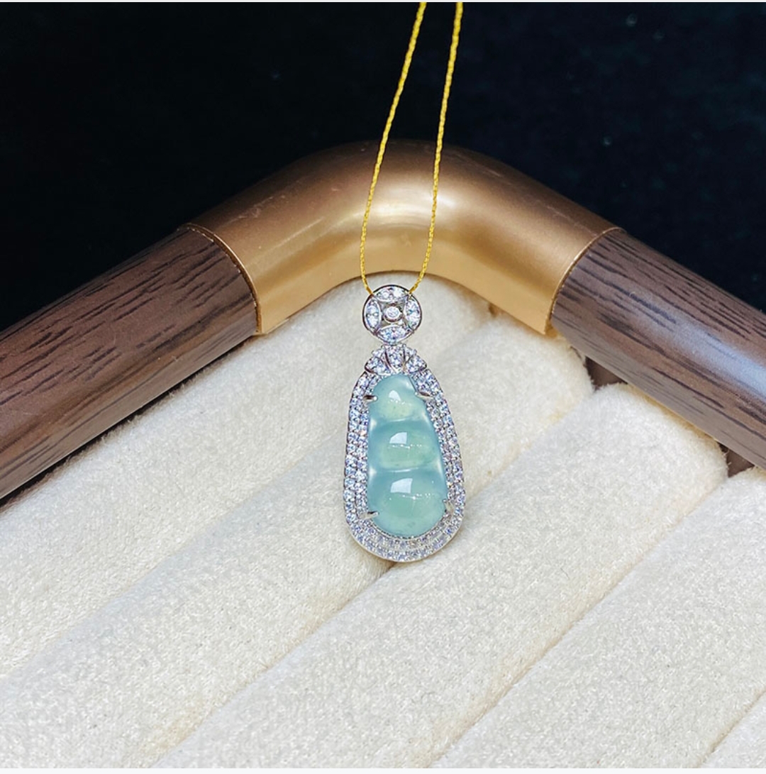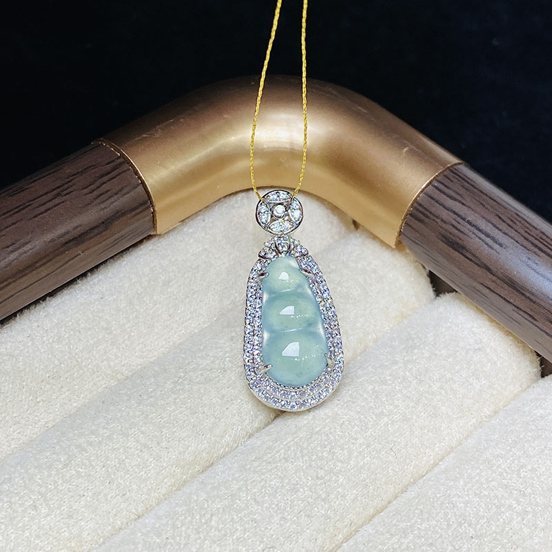 御玺坊系列 蓝水翡翠A货四季豆吊坠项链 翡翠A货 单只附赠精美礼盒【一证一物】